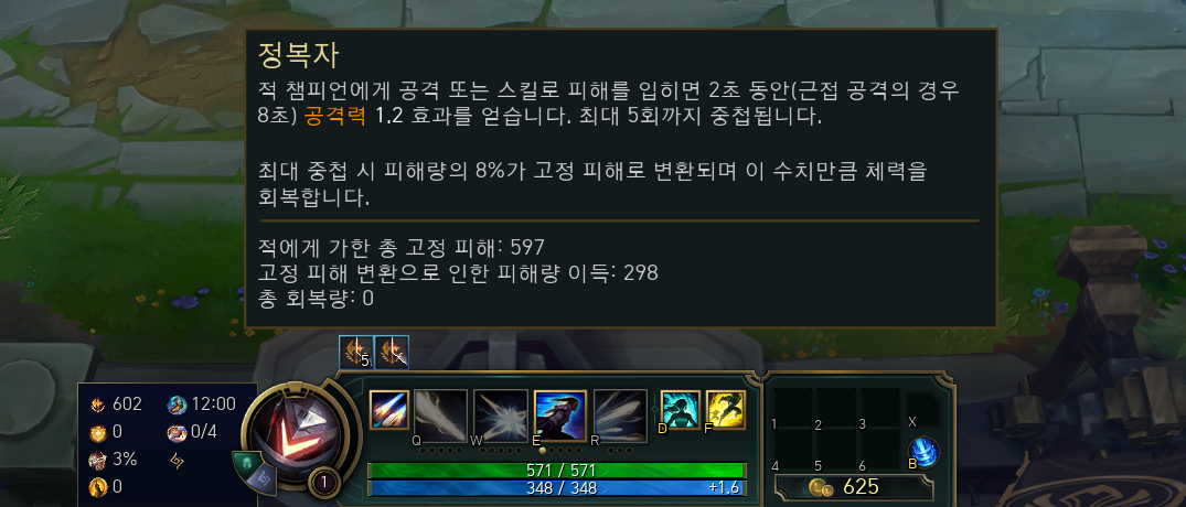 아무튼! 이것이 5회가 중첩이 될때, 팅! 하면서 풀 스택이 되면서 챔프 주변에 금색 오오라가 도는데, 그때부터는 입힌 피해량의 8%가 고정 피해로 바뀌고, 그 수치만큼 체력 흡수를 한다.