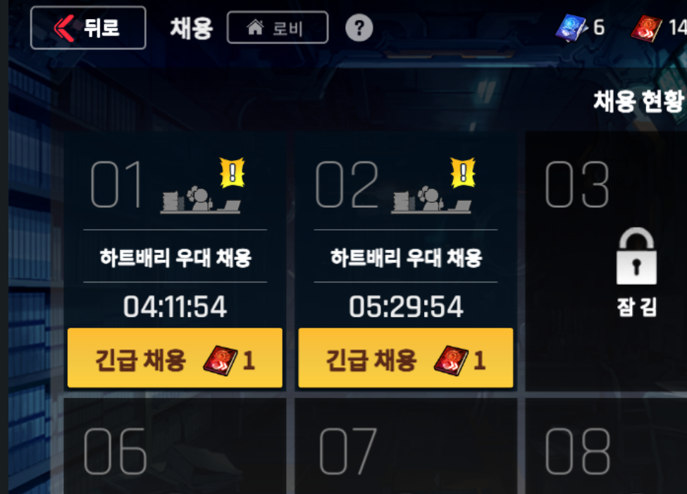 우측 상단의 푸른색 책이 재화다. 해당 시간이 다되어야 캐릭터를 확인할 수 있는데, 붉은색 책은 즉시완료가 가능하다.